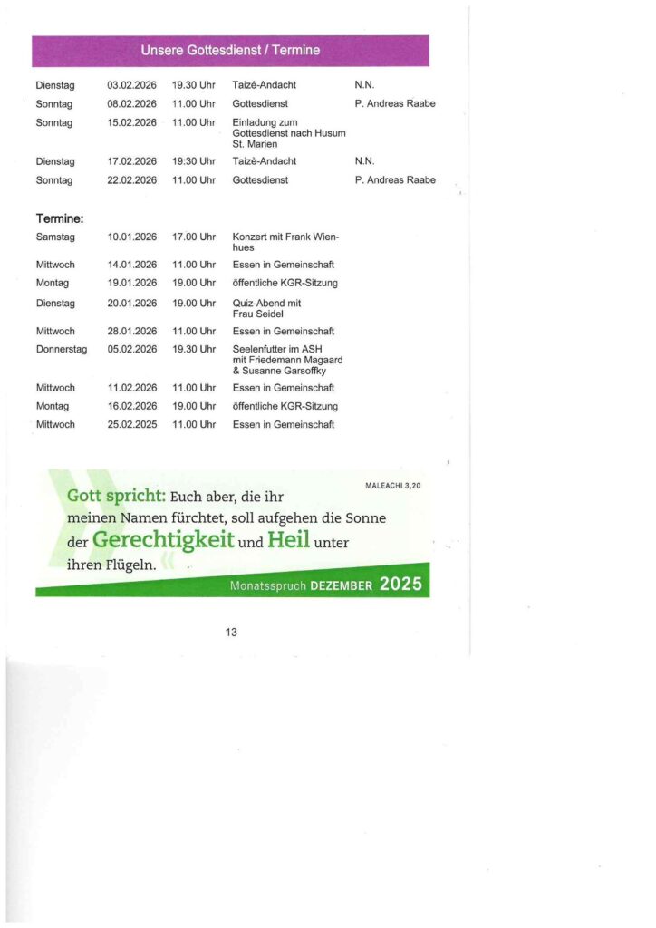 | Kinderkonfirmanden | Dienstag 16.00-17.30 Uhr jeweils von Januar bis Ostern |